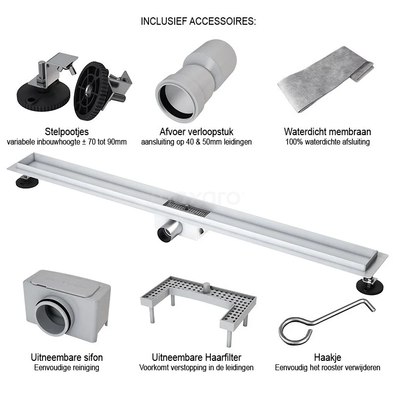 U ervaart ultiem onderhoudsgemak met dit model. Deze douchegoot beschikt onder andere over een haarfilter. Hierdoor zijn verstoppingen van uw leidingen voorgoed verleden tijd. Verder zorgt de flensrand en het waterdicht membraan voor een 100% waterdichte afsluiting. Daarnaast is de goot voorzien van een uitneembare sifon. Schoonmaken kost u op deze manier maar weinig tijd en moeite.
