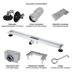 U ervaart ultiem onderhoudsgemak met dit model. Deze douchegoot beschikt onder andere over een haarfilter. Hierdoor zijn verstoppingen van uw leidingen voorgoed verleden tijd. Daarbij zorgt de flensrand en het waterdicht membraan voor een 100% waterdichte afsluiting. Tevens is de goot voorzien van een uitneembare sifon. Schoonmaken kost u op deze manier maar weinig tijd en moeite.